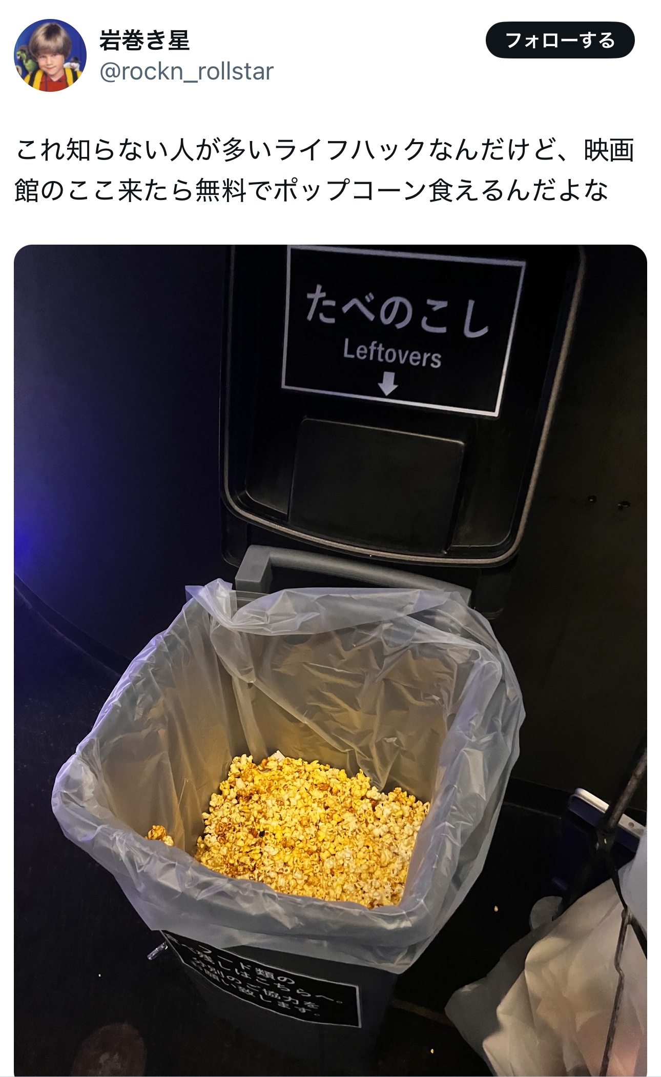 これ知らない人が多いライフハックなんだけど、映画館のここ来たら無料でポップコーン食えるんだよな