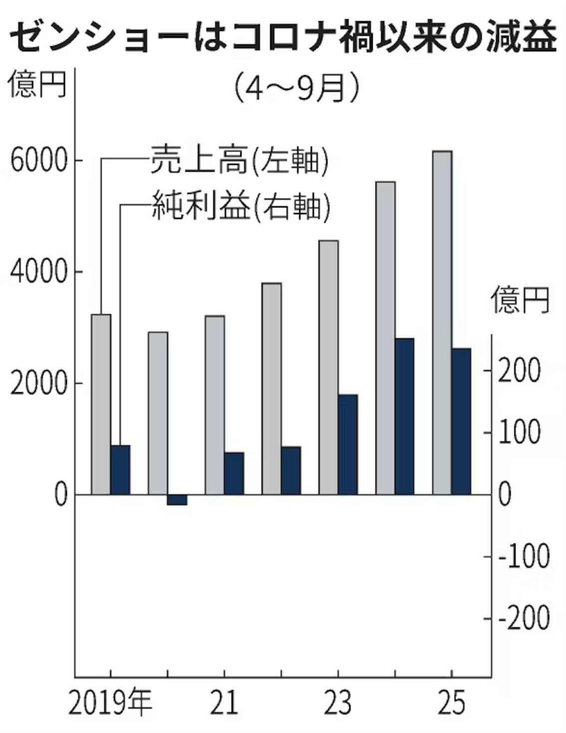 ゼンショーホールディングスが11日発表した2025年4~9月期の連結決算は、純利益が前年同期比6%減の232億円だった。同期間では新型コロナウイルス禍以来5年ぶりの減益だった。牛丼の「すき家」事業でコメ価格が高騰し売上原価が膨らんだ。3月に国内の複数のすき家店舗で異物混入が発覚した影響で客数減が続いたことも響いた。