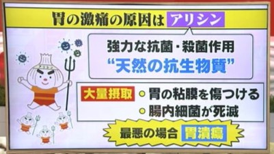 アリシンには強力な抗菌・殺菌作用があり、天然の抗生物質とも呼ばれています。「体に良さそう」と感じますが、大量に摂取すると強力な抗菌・殺菌作用が胃の粘膜を傷つけたり、腸内細菌を死滅させたりしてしまうことがあるんです。最悪の場合は胃潰瘍になることもあるそうです。