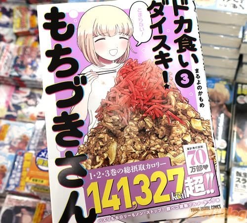今回発売になったコミックス「ドカ食いダイスキ!もちづきさん」3巻【AA】には第12話~第17話と、「【セブン-イレブン】トクベツ編」、描き下ろしを収録(もくじ)し、発売日のメロン秋葉原1号店には既刊とともに展開した特設コーナーもあり、オビ謳い文句は『1・2・3巻の総摂取カロリー、141,327kcal超!累計発行部数70万部?』で、裏表紙は『一刻も早く、早く食べたい…!』、『ストレス・空腹…我慢の限界!欲望リリース食べま狂(くる)?』などだった。
