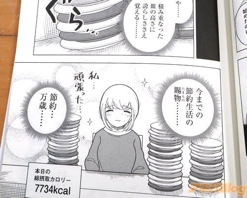タイトルのインパクトに引き寄せられて読んだ本作は、グルメコミックの枠を越えた独特な世界観が展開されていました。とにかく、主人公で会社員の望月美琴さんの食事シーンはタイトルどおり驚異的で、その摂取カロリーの高さには思わず顔が引きつってしまいます。