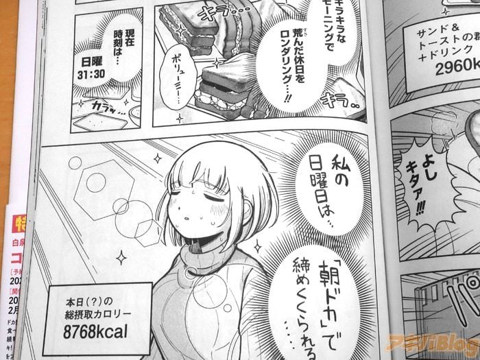 今回発売になったコミックス「ドカ食いダイスキ!もちづきさん」2巻【AA】には第7話~第11話と、「【CoCo壱】トクベツ編」・「【ニチレイ】トクベツ編」、描き下ろし漫画、コラボカフェ描き下ろしキービジュアルギャラリー(※)を収録(もくじ)し、アキバのお店には販促POPもあり、オビ謳い文句は『【カロリー】と【バズり】が止まんねぇ!【ゴハン】【重版】おかわり美味い!44万部完食♥』、『ガッツリこってり山盛り食べちゃう食欲乙女の禁断グルメ・ギャグ★』になってた。
