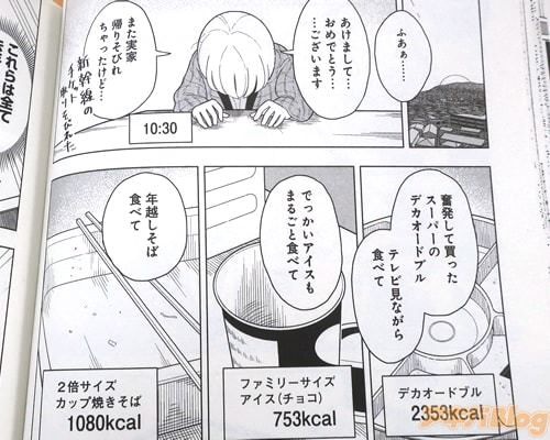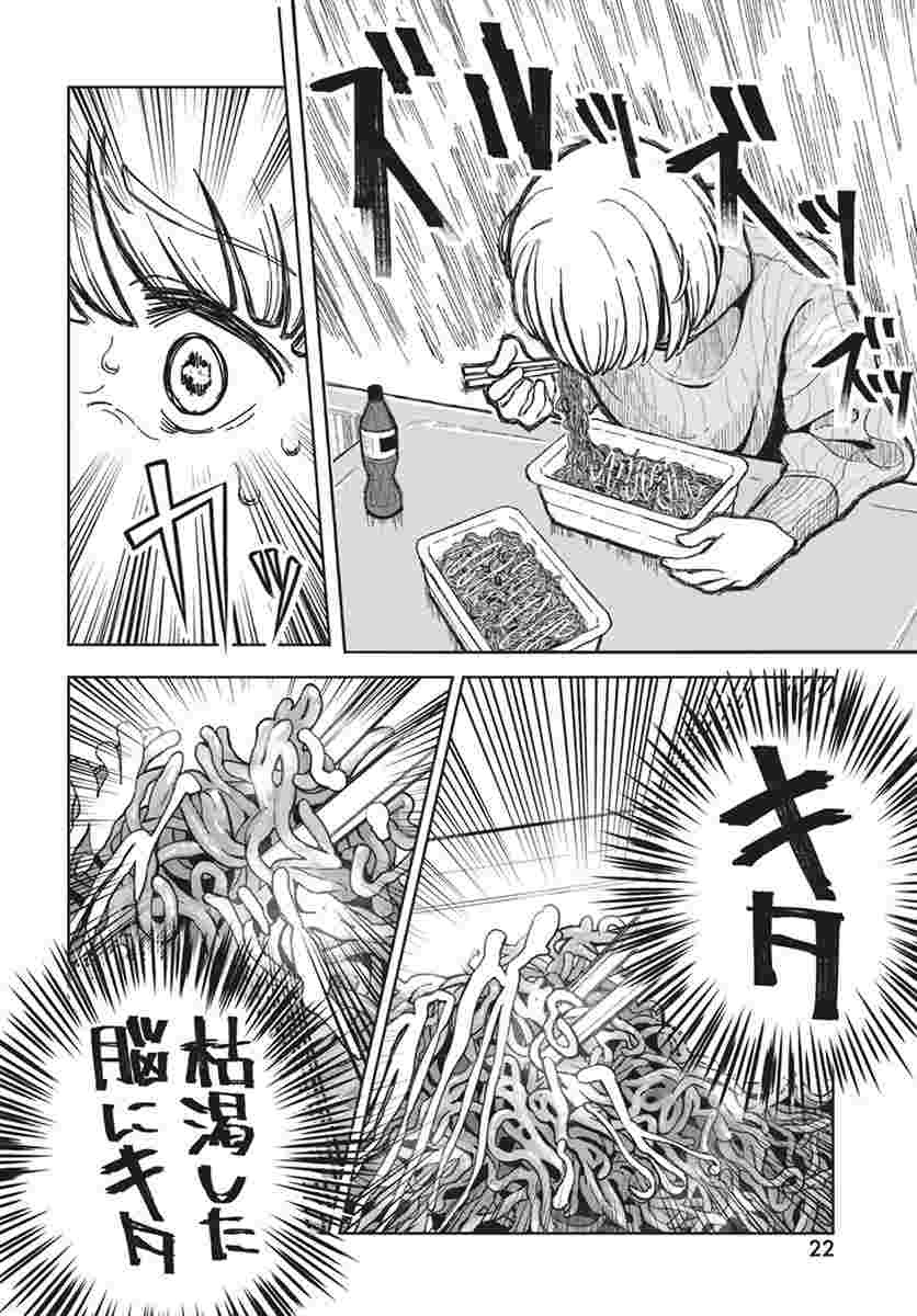 「ドカ食いダイスキ! もちづきさん」は、カロリーのオーバードーズ“ドカ食い”で血糖値を爆アゲすることによりストレス社会をサバイブする社会人女性・望月美琴の物語。「皆さんは何に幸せを感じますか?」「私は『ドカ食い』で生きる喜びを感じます」という望月にとってドカ食いはただの食事ではなく、禁断の快楽を得る手段であり、健康を気にせず「血液が塩水になりそう」なほどしょっぱい味付けを彼女は喜ぶ。血糖値が上がりすぎると「至ってしまう」が、人前で「至ってしまう」のは望月さんでもさすがに恥ずかしい。しかし深夜残業で空腹を我慢できなくなった望月さんは、まだ会社にも関わらず「クソデカカップ焼きそば」2個というドカ食いを始めてしまう。