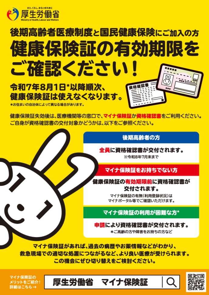 厚生労働省が、後期高齢者医療制度と国民健康保険の加入者に対し、健康保険証の有効期限を確認するよう、Xの公式アカウントで呼び掛けています。