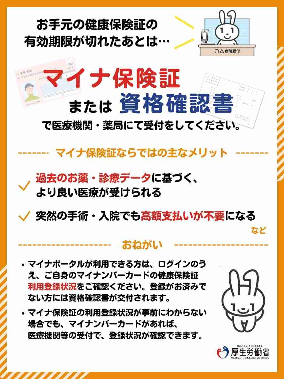 健康保険証の有効期限が切れた場合は「マイナ保険証」「資格確認書」のいずれかで受診できるということです。