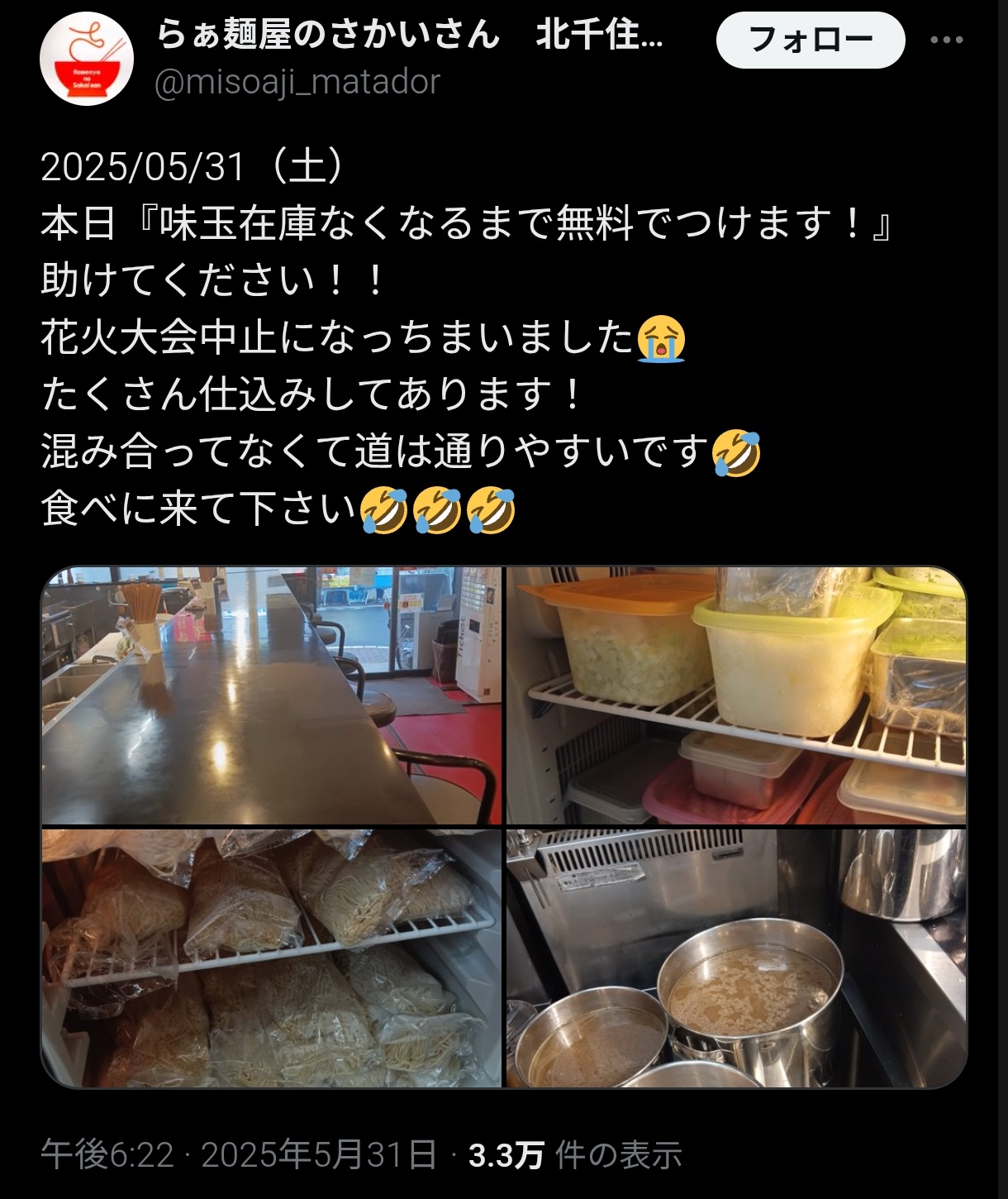 「助けてください! たくさん仕込みしてあります😭 食べに来て🤣」 花火大会が中止になった足立区のラーメン屋さん