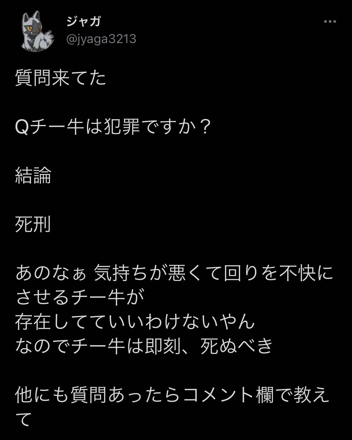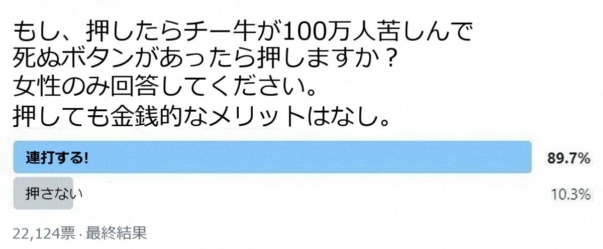 ただの弱者ならまだ生きてていいが、他人に危害をくわえたり迷惑かけるチーが生きてていいわけ無いだろ