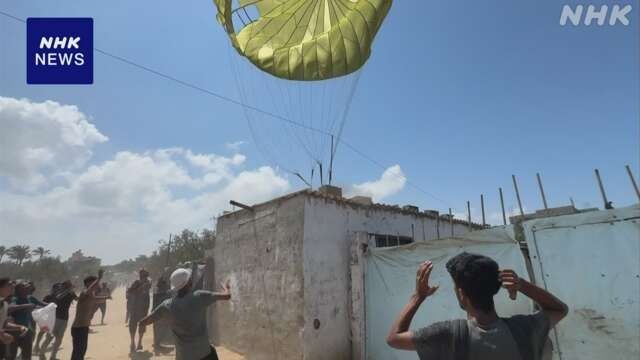 映像では、多くの男性や子どもたちが空を見上げてパラシュートの付いた物資の動きを確認しながら、落下地点を目指して走っていきました。