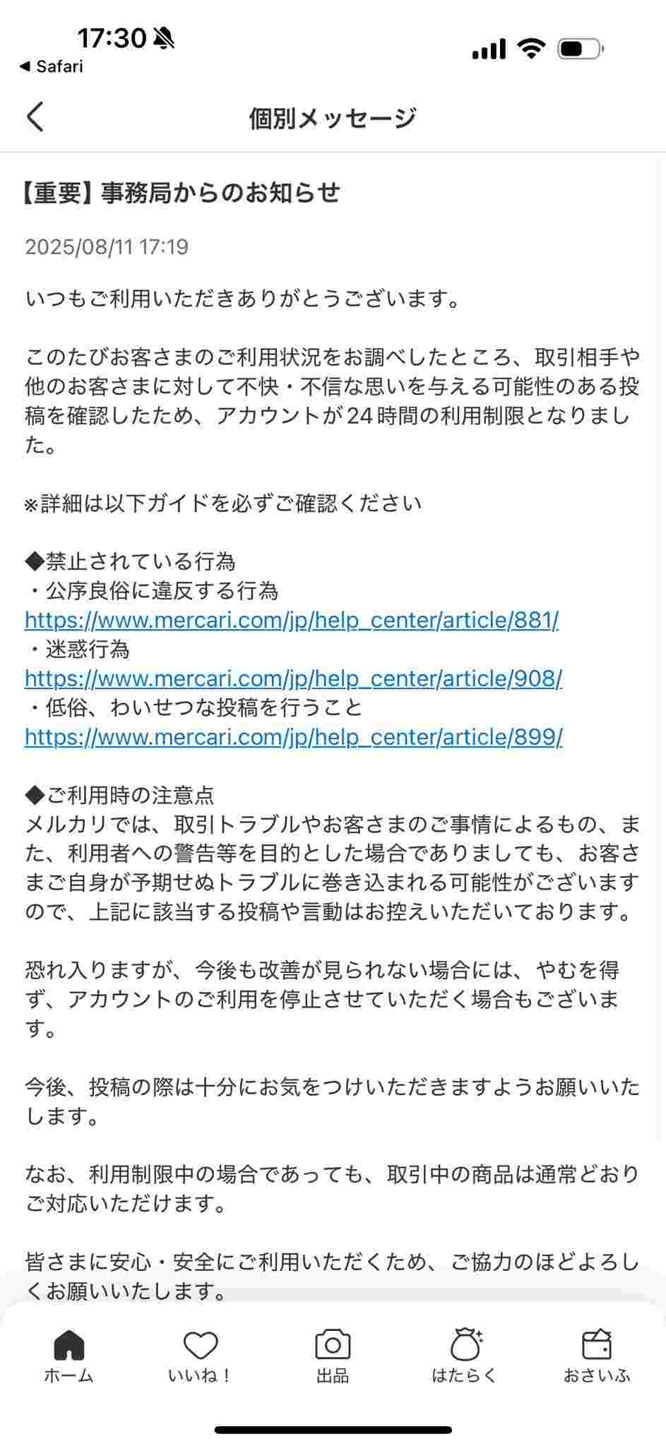 通報しまくってメルカリ側の作業を増やしてんだから、警告受けて当たり前では?