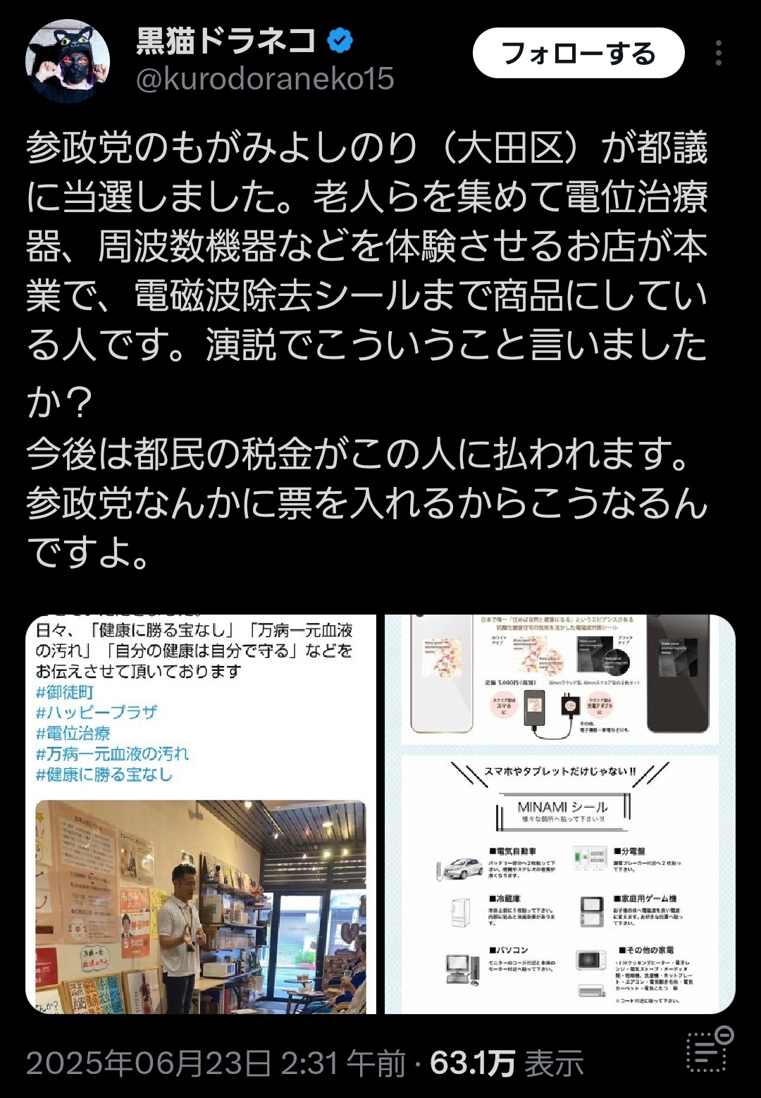【カルト】当選した大田区の参政党都議、電磁波除去シールを売る筋金入りだった🤗これで都民の健康も守れるね!