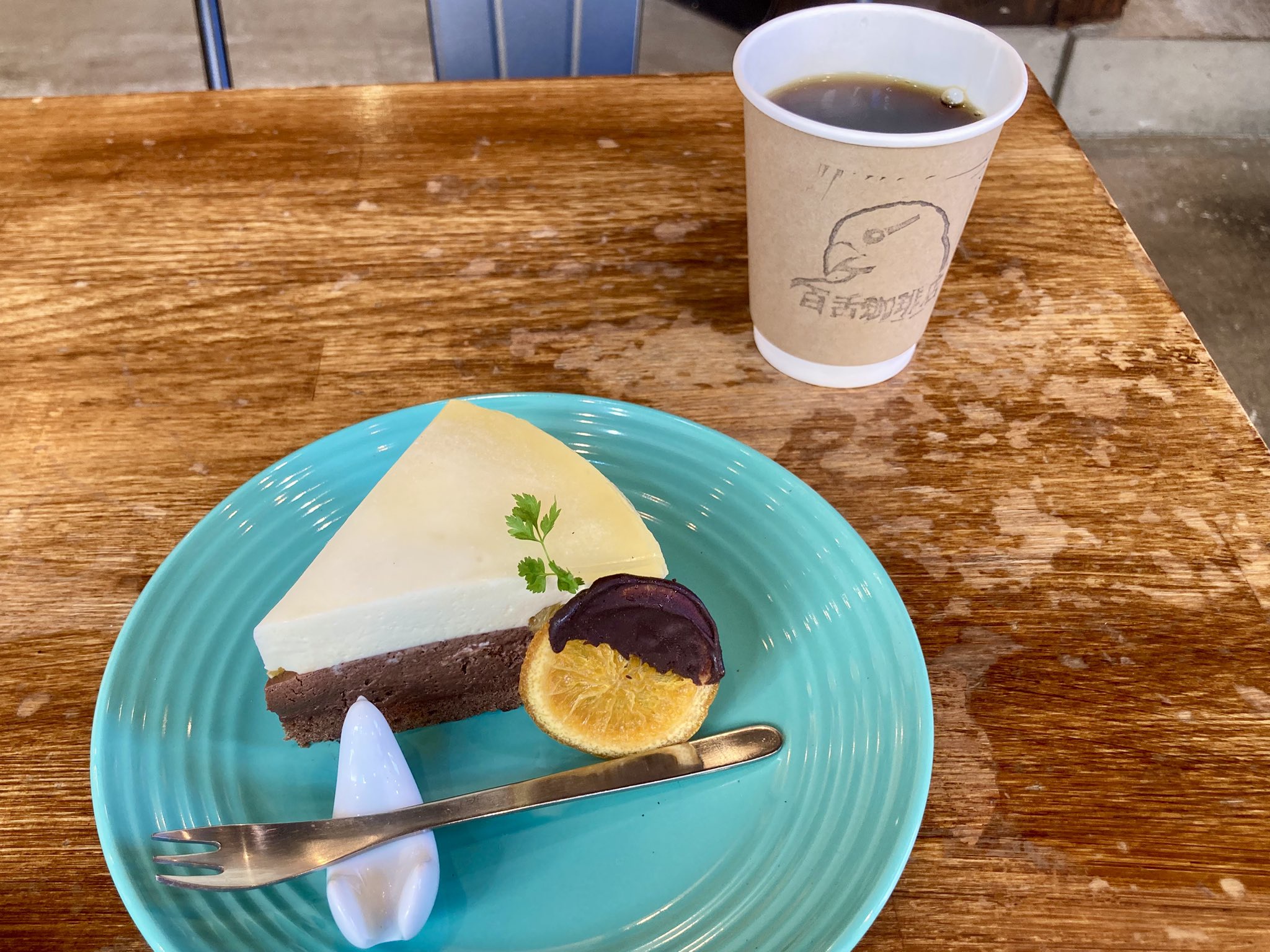 ケーキと紙コップのコーヒーがアンバランスで判断に迷う