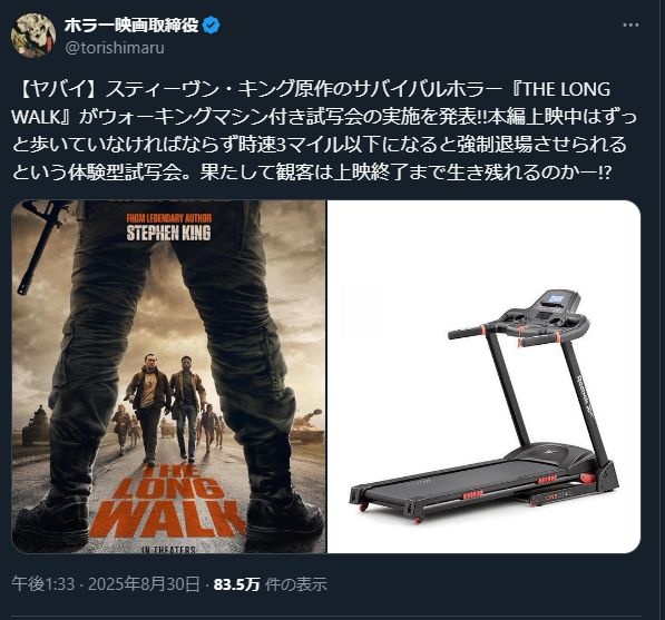 【マジキチ】映画「死のロングウォーク」を見ながらウォーキングマシーンで歩き続けるイベントが発生!脱落したら退出の模様