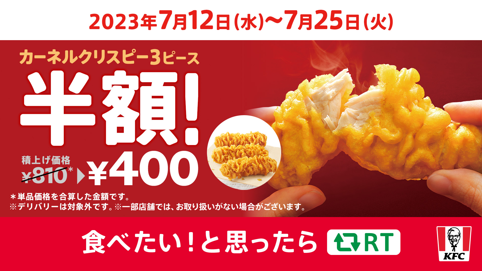 7月25日(火)までの期間限定で #カーネルクリスピー 3ピースが【400円】🎉