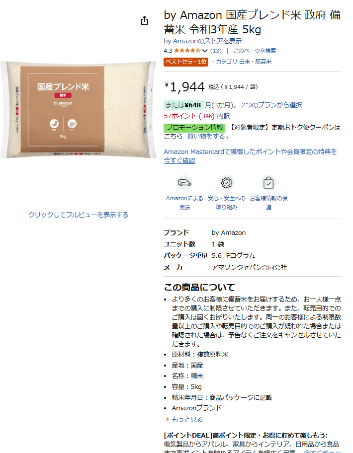 【乞食速報】by Amazon 国産ブレンド米 政府 備蓄米 令和3年産 5kg¥1,944 税込
