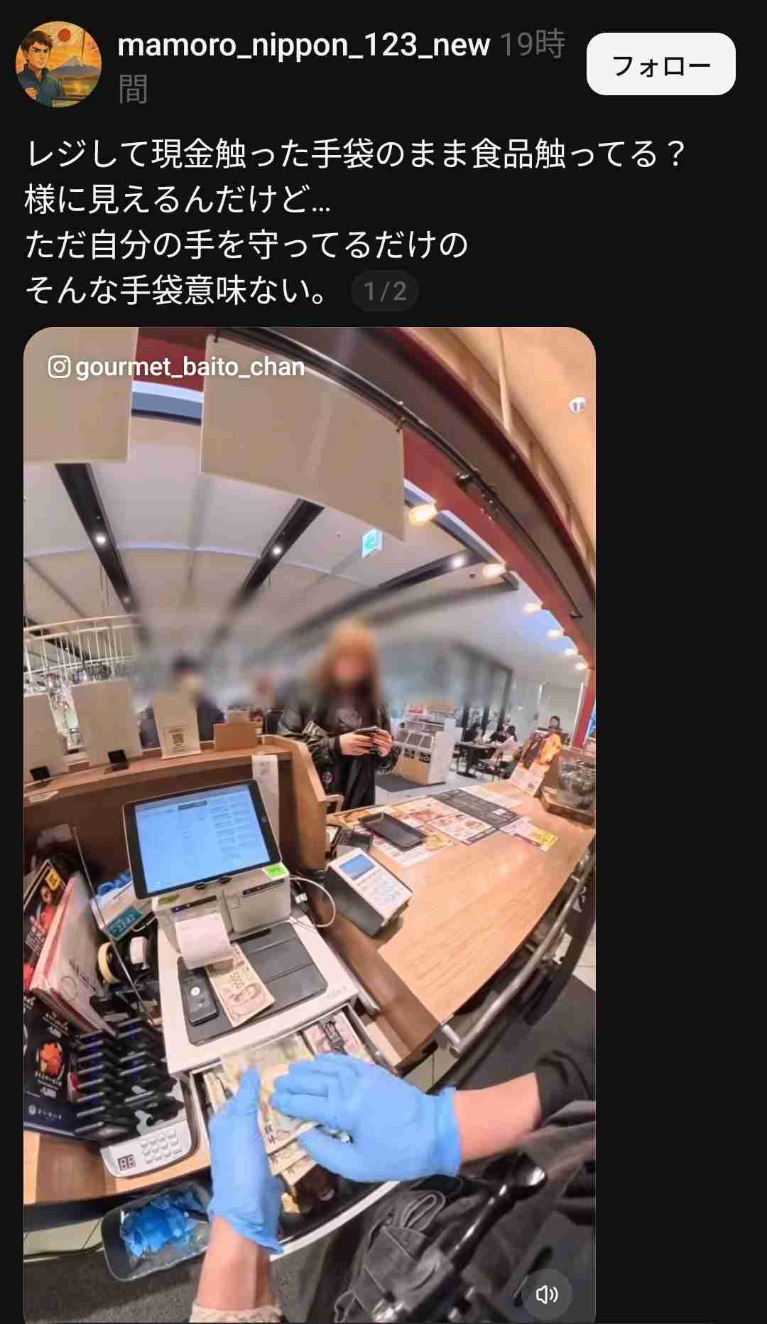 現金触った手袋で料理触ってんなら、マジで東南アジアの土人以下の衛生観念