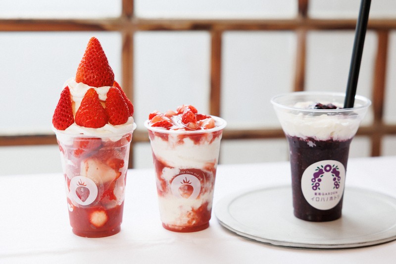 第83期名人戦第4局1日目午前のおやつに永瀬拓矢九段が注文した「いちごモンスター」と「ゴロゴロ苺のミルキーシェイク」、「USA産ブルーベリーフローズン」=大分県宇佐市の宇佐神宮で2025年5月17日午前9時36分、吉田航太撮影