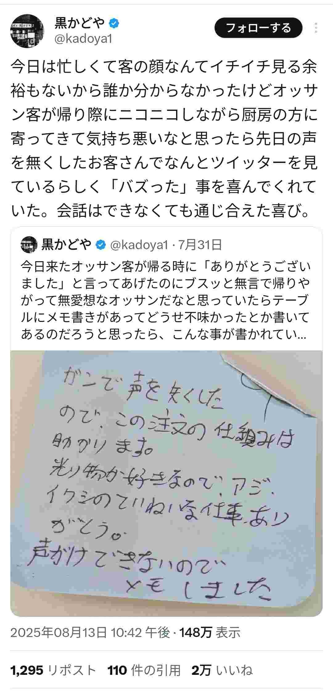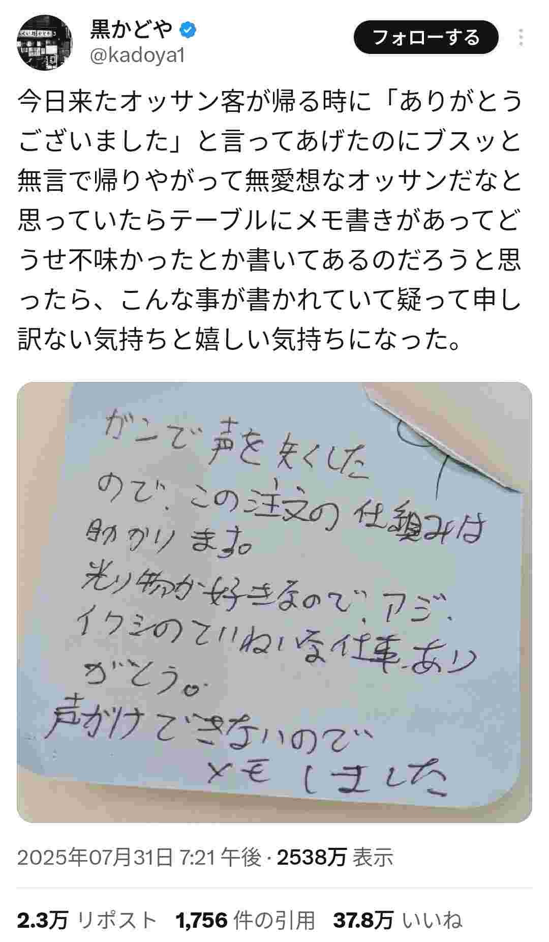 「この注文の仕組み」が何か分からないと質問がきたけど、当店では人手不足で少人数で運営する為と値上げしない為に注文は客が自らふせん(メモ)に手書きして店員に渡す方式にした。タッチパネルを導入するカネもないし。この注文方法だと声の不自由な人に好都合だとは目から鱗だった。
