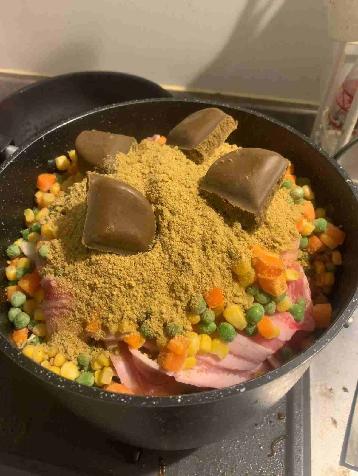 ミックスベジの層の上に粉と均等なルー刺さってんの笑う