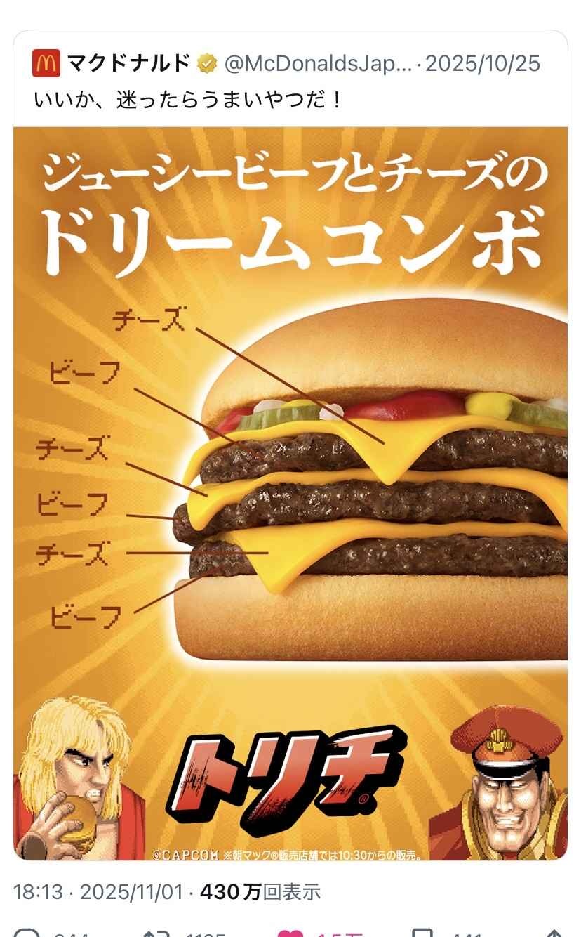 ちょうど今トリチ食ったけど、ダブル肉厚ビーフのほうが美味いわ