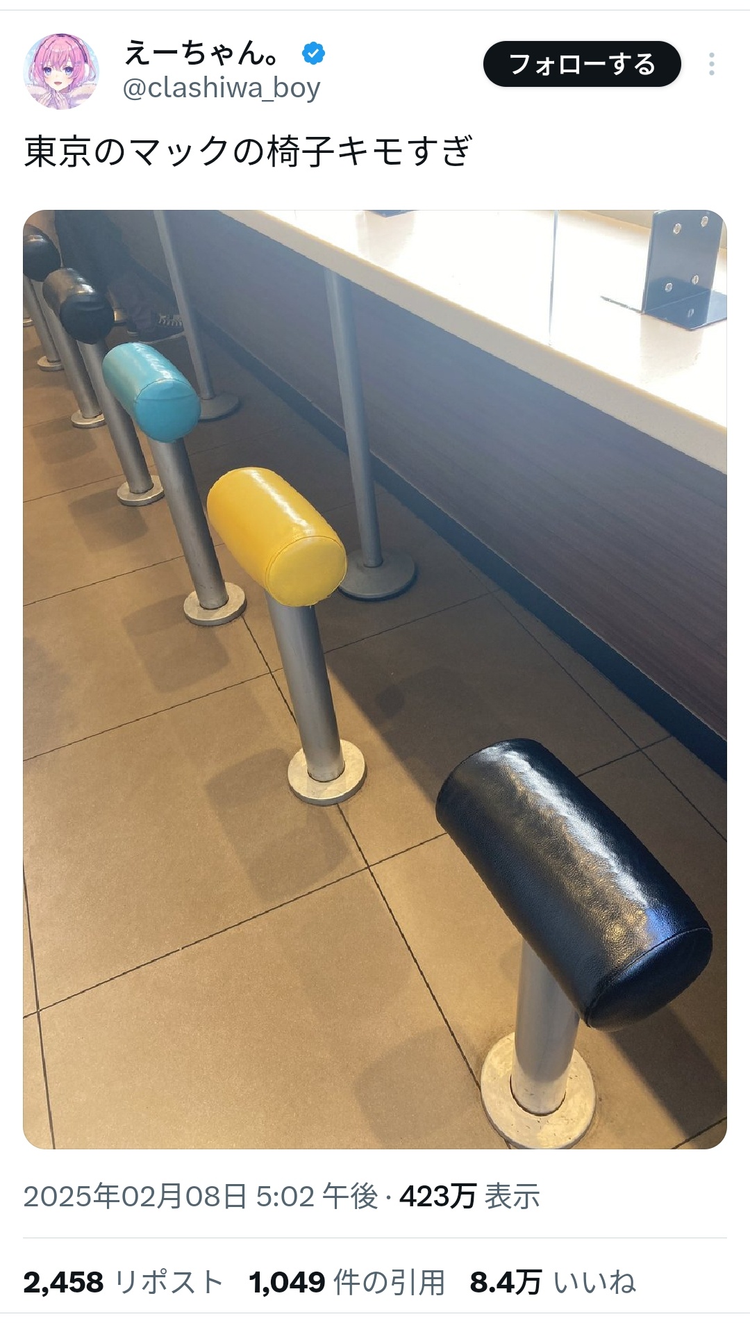 ぶっちゃけファストフード系は牛丼屋含めて全部椅子いらんわw