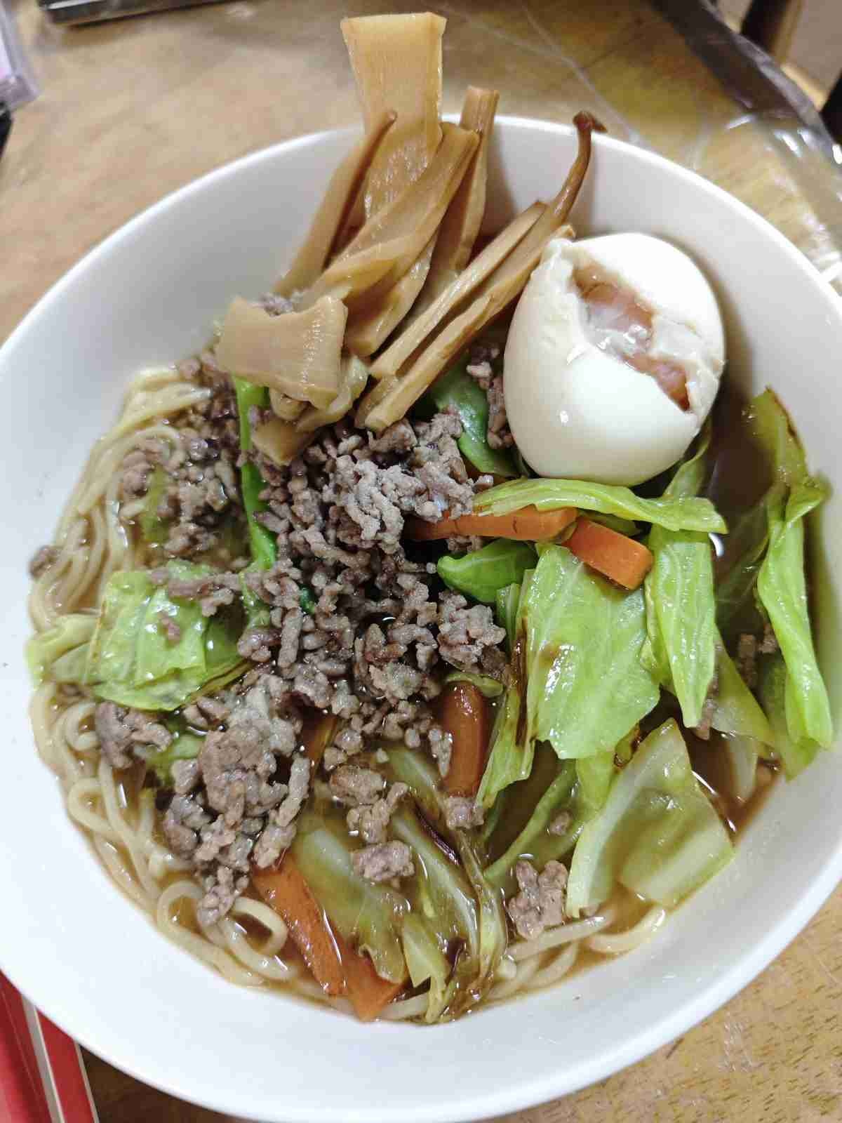キャベツと人参と卵とメンマとひき肉入ってるよ😳