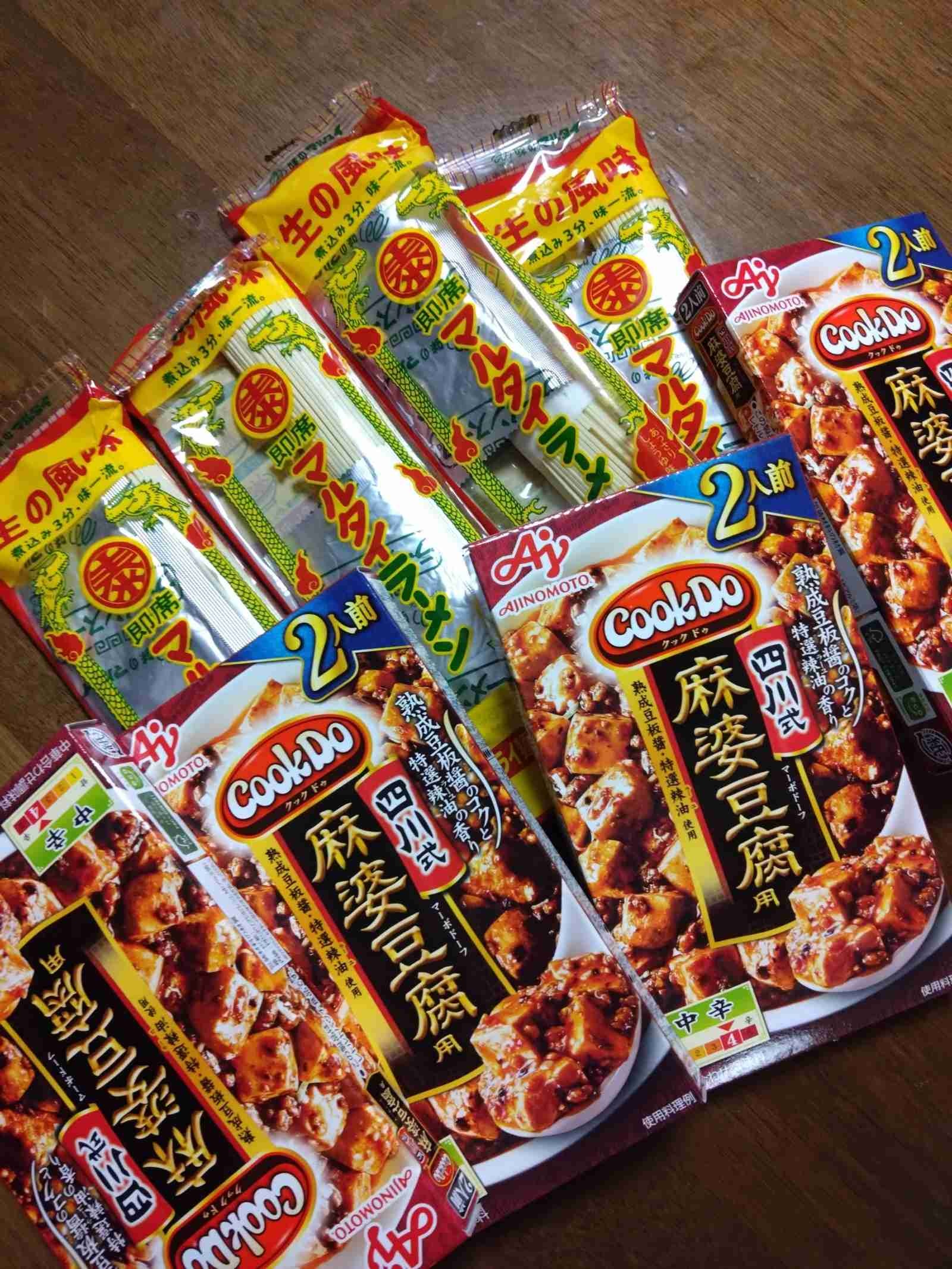 麻婆豆腐のもととマルタイラーメンもビール買ったオマケで付いてきたやつなんや