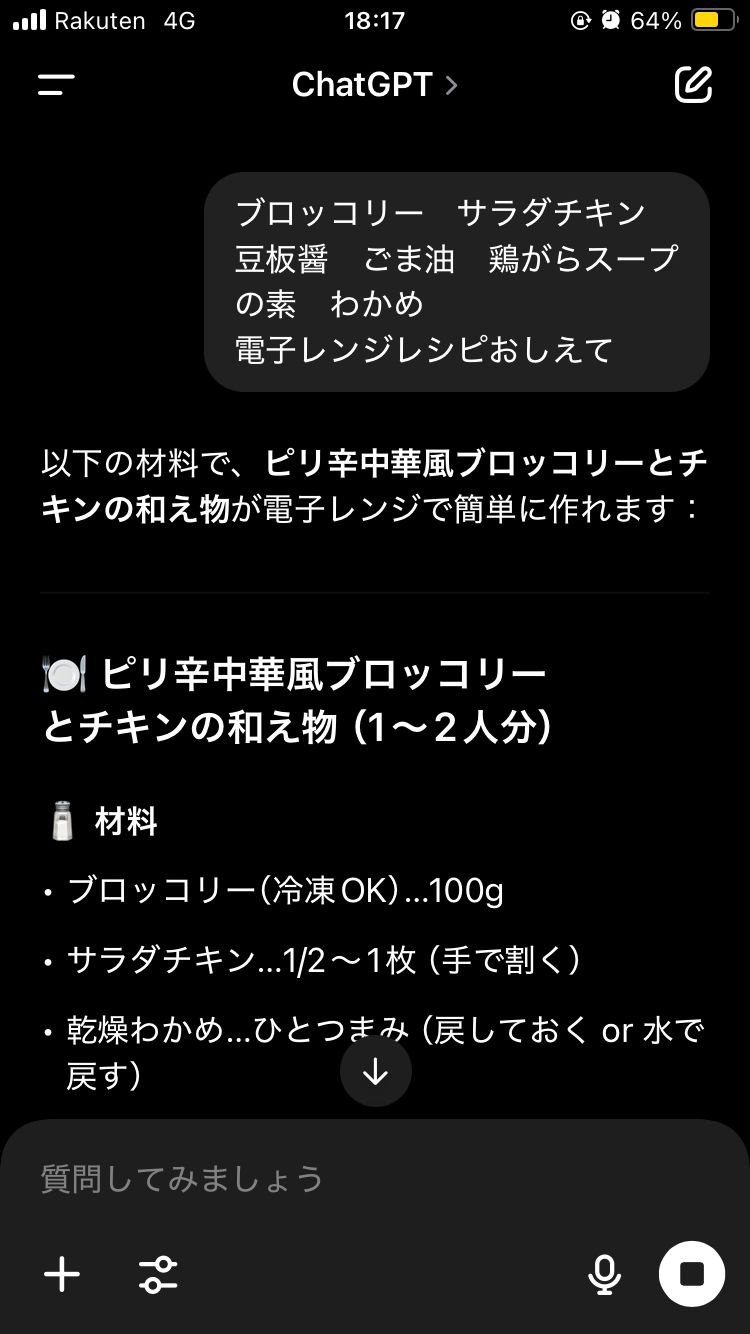 食材書けば自分に合ったレベルの料理3つくらい案出してくれるし飯はこいつ頼みになってる