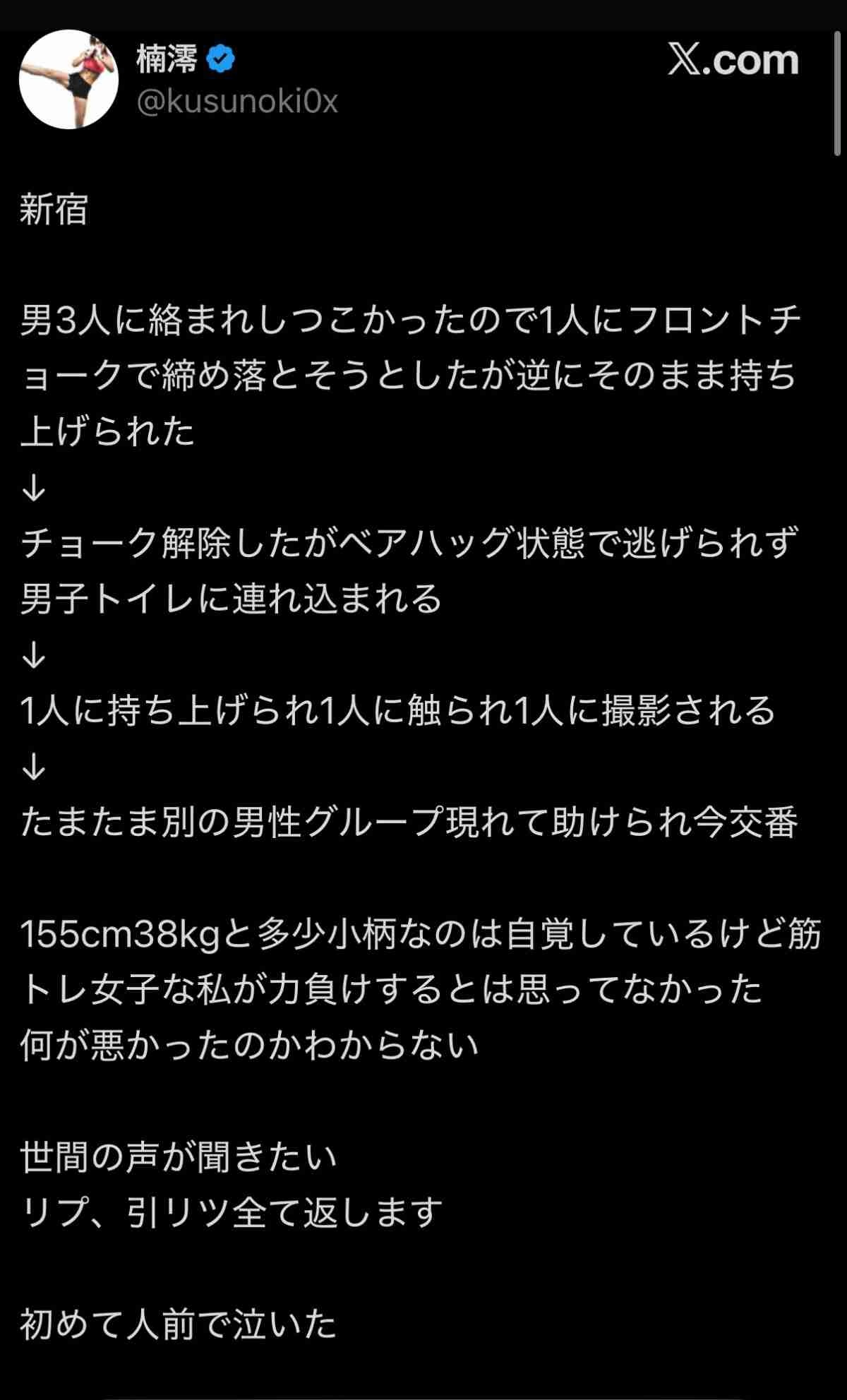 【画像】筋トレ女子(155cm38kg)「男に力負けして泣いた。何が原因かわからない。」