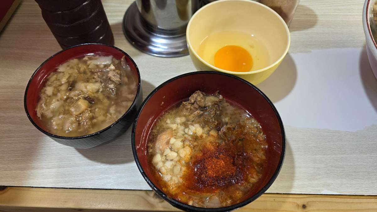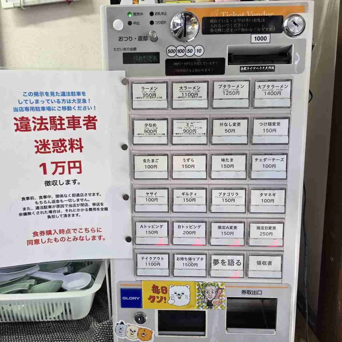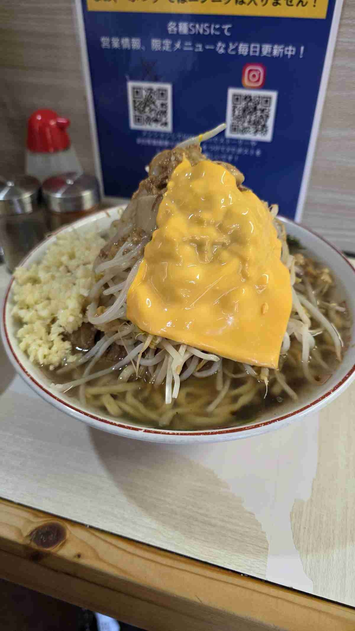 さらにトッピングに「チェダーチーズ」、「生たまご」、「ギルティ(高級トウガラシ、豚カス、アブラ、粗ニンニクが入ったトッピング)」、「ブタゴリラ(ブタカスがゴリゴリ入ったアブラ)」をチョイス。
