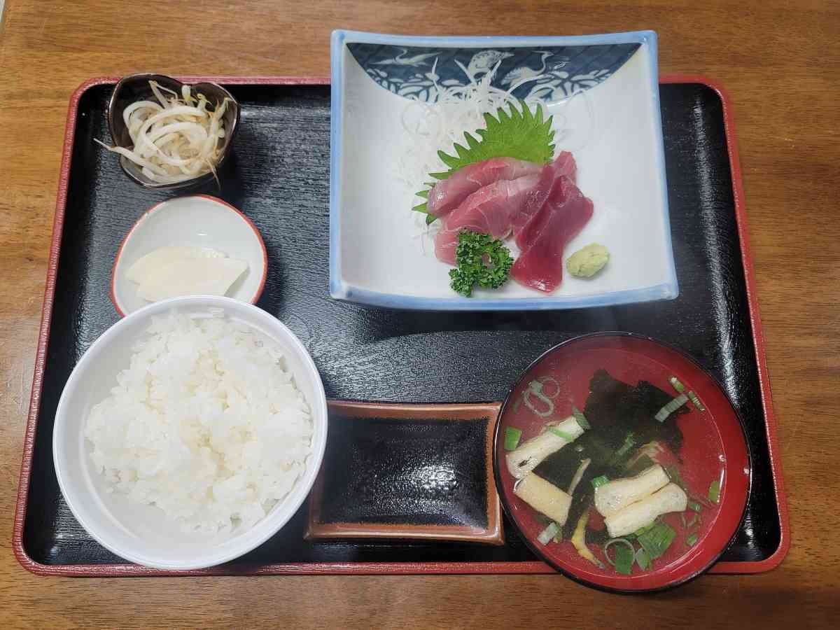 白いご飯に刺し身四切れはきっついわぁ…食い始めたら悲しい気持ちになると思う