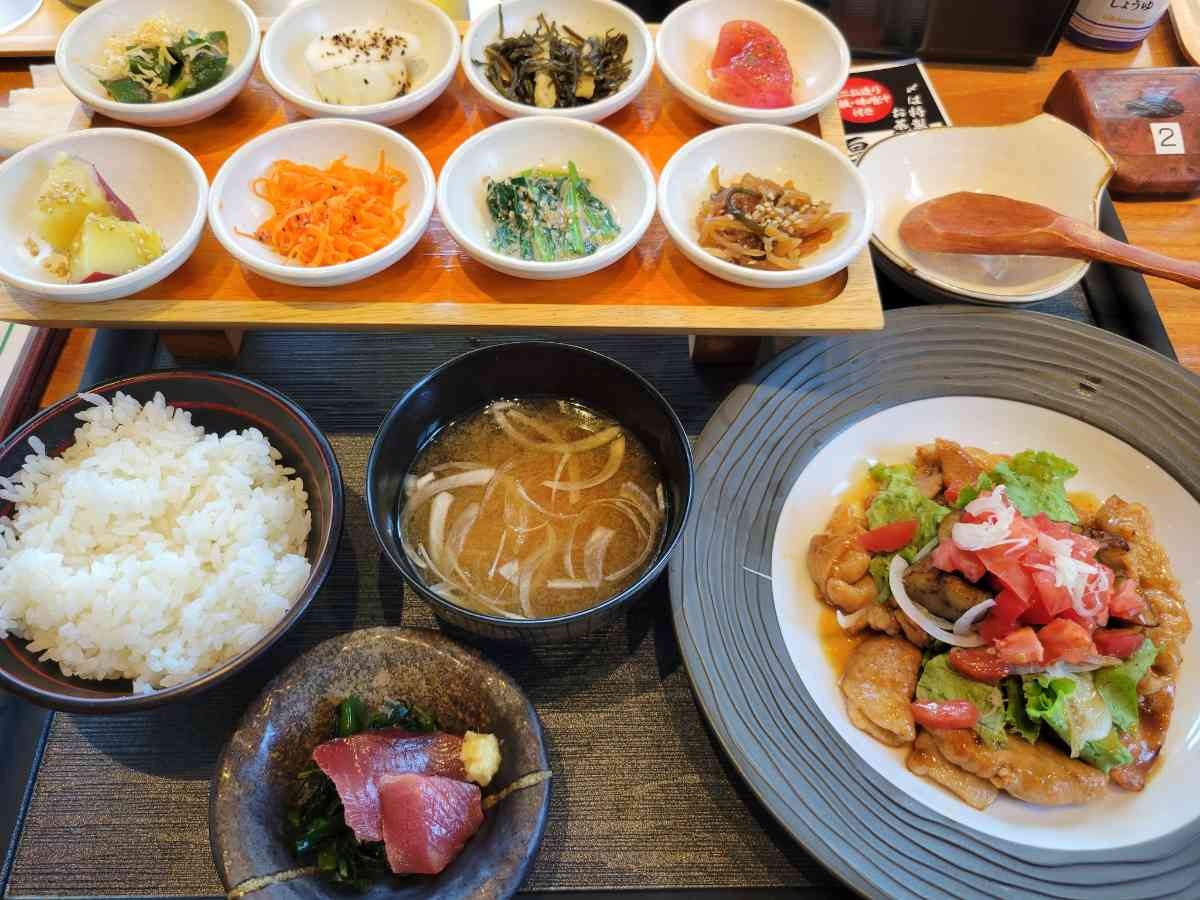 小鉢とマグロ、豚ロースの上のトマトサラダ抜きにして500円なら出せる