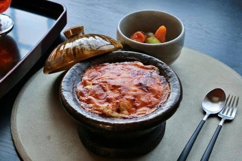 メニューブックによると、京都・美山の鹿を使ったラグーと京都古来の白いんげん豆「祇園豆」を包み込んだ。 飲み物は「和紅茶の照り葉を添えて」。 和紅茶に照り葉羊羹を散らしているという