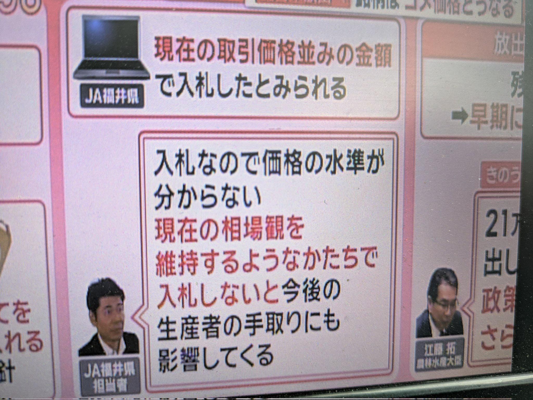 このうち、県内産のコメは「ハナエチゼン」と「あきさかり」合わせて2400トン余りが含まれていて、JA福井県は県産米を優先に入札に臨みました。