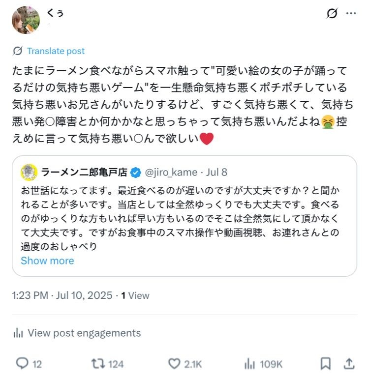 たまにラーメン食べながらスマホ触って”可愛い絵の女の子が踊ってるだけの気持ち悪いゲーム”を一生懸命気持ち悪くポチポチしている気持ち悪いお兄さんがいたりするけど、すごく気持ち悪くて、気持ち悪い発○障害とか何かかなと思っちゃって気持ち悪いんだよね🤮控えめに言って気持ち悪い○んで欲しい❤
