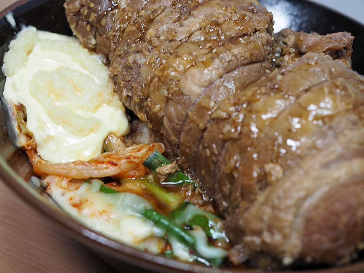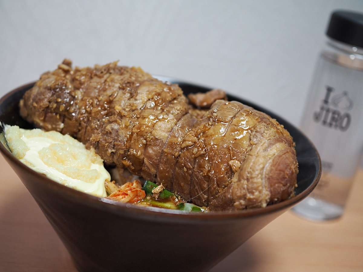 ニラキムチにとろけるチーズとニンニクチューブマヨ、最後に豚丸々一本乗せて完成!豚から出てくる肉汁がご飯に染みて込んで最高の一杯でした!!!!!!!!