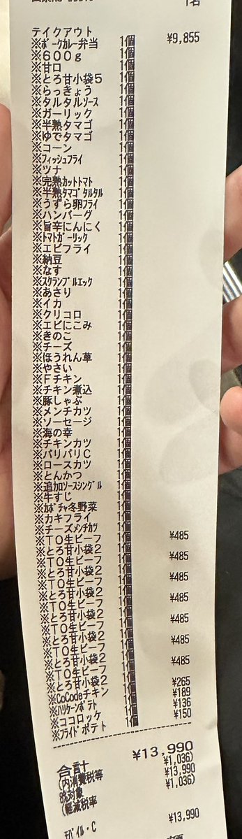 値段に関する質問が多かったので、レシート添付しておきますトッピング全種+ご飯600g+カレールー2.7kg注文で約14000円でした。