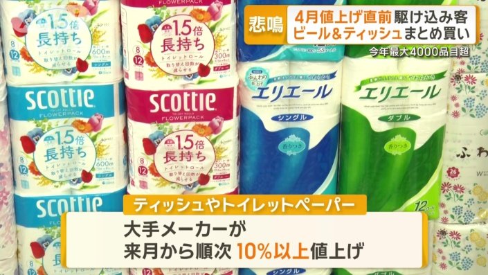 日用品のティッシュやトイレットペーパーは、大手メーカーが来月から順次、10%以上値上げします。止まらない値上げラッシュ。