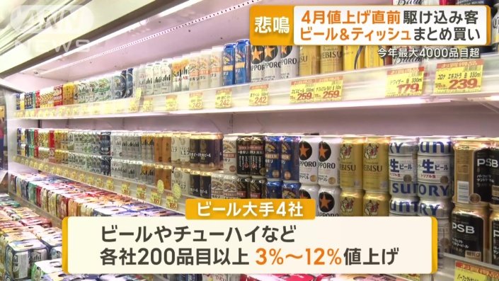 【絶望】来週からのビールやティシュー・トイペパの暴騰値上げを前にまとめ買い客がスーパーに押し寄せてる模様