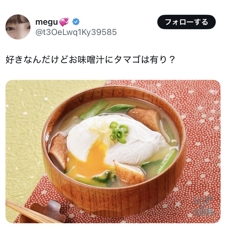 最近はインスタント麺に卵ばかりで味噌汁卵は食ってないけど画像の半熟も固めもどっちも大好きだわ