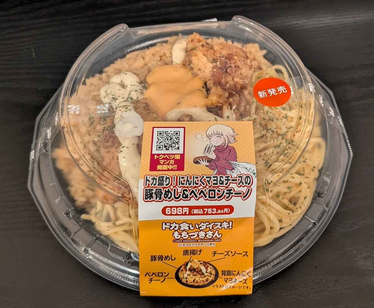 筆者が購入したのは、2025年11月18日に『セブン-イレブン』が発売した『ドカ盛り!にんにくマヨ&チーズの豚骨めし&ペペロンチーノ』です。