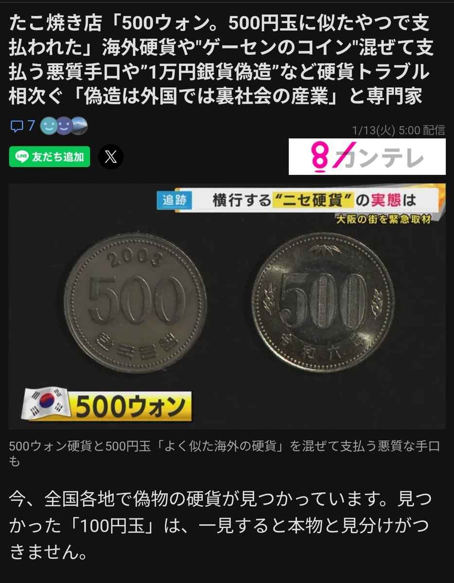 たこ焼き店「500ウォン。500円玉に似たやつで支払われた」海外硬貨や”ゲーセンのコイン”混ぜて支払う悪質手口や”1万円銀貨偽造”など硬貨トラブル相次ぐ「偽造は外国では裏社会の産業」と専門家(関西テレビ) – Yahoo!ニュース