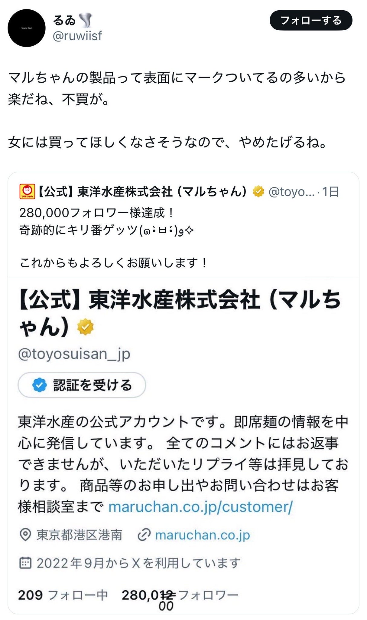 まんさん、東洋水産にブチギレ!怒りの不買運動敢行中wwwwwwwwww