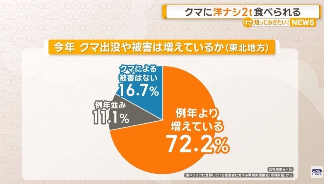 クマの被害が深刻な東北地方では、7割以上の生産者が「例年より被害が増えている」と回答しました。