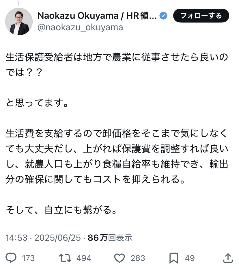 コンサル「ナマポ全員を農業で働かせれば食糧自給率が上がる」