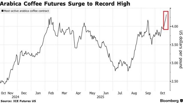コーヒーの価格が8月以降、50%上昇し、1ポンドあたり史上最高の4.38ドルになりました。この急騰の主な原因は、8月に発効したアメリカのブラジル産コーヒーに対する50%の関税です。さらにブラジルでの干ばつや取引所の在庫減少も影響しています。在庫は2024年初頭以来の最低水準で、ブラジル豆の供給は記録的に少なくなっています。ブラジルは世界最大のコーヒー輸出国で、2024年の世界生産量の38%を占めます。この状況から、コーヒーは日常品から贅沢品に近づいています。