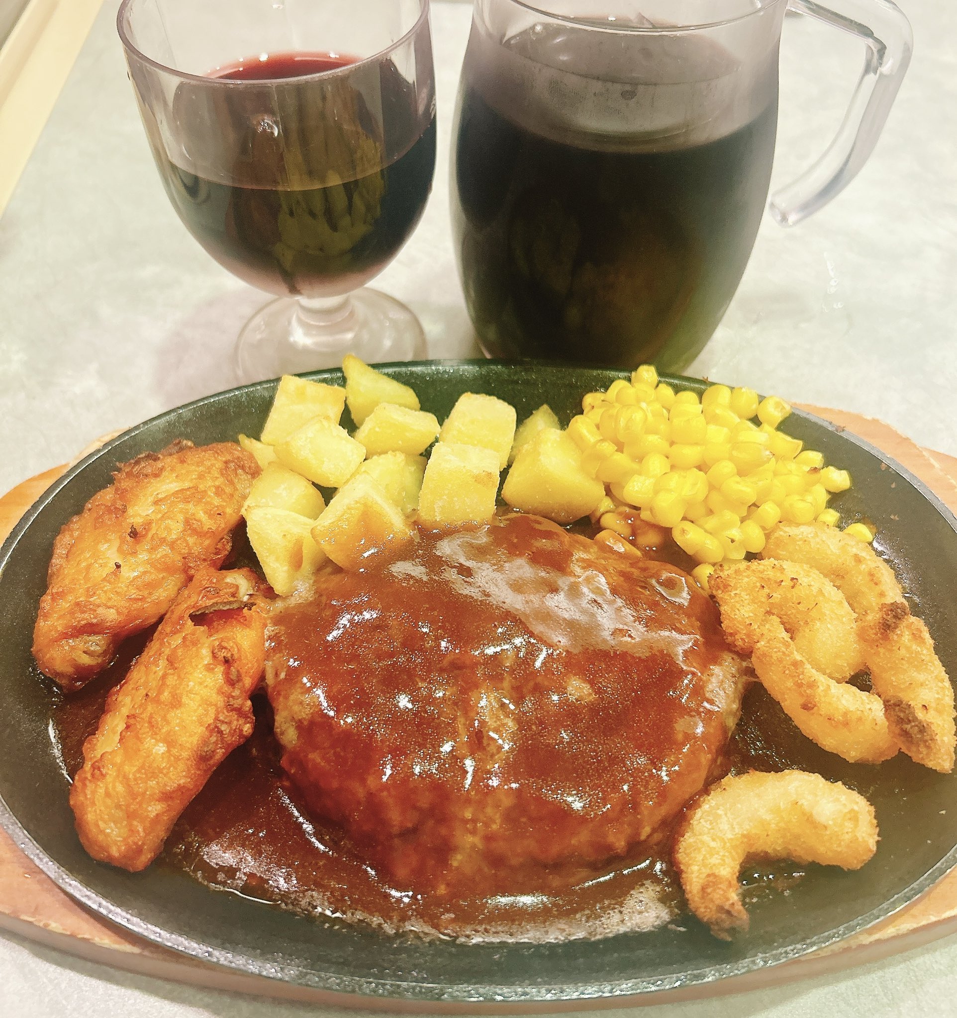 (ハンバーグ、辛味チキン2P,ポップコーンシュリンプ5P、ポテト、コーン)