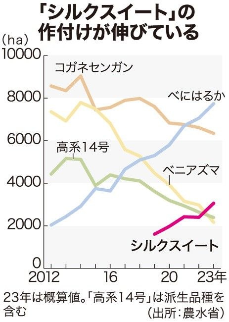 サツマイモの品種別作付面積で、「シルクスイート」が大幅に拡大し、青果用品種で2位になったことが農水省の調査で分かった。「ベニアズマ」「高系14号」を抜いた。首位の「べにはるか」と同様、粘性がありしっ…