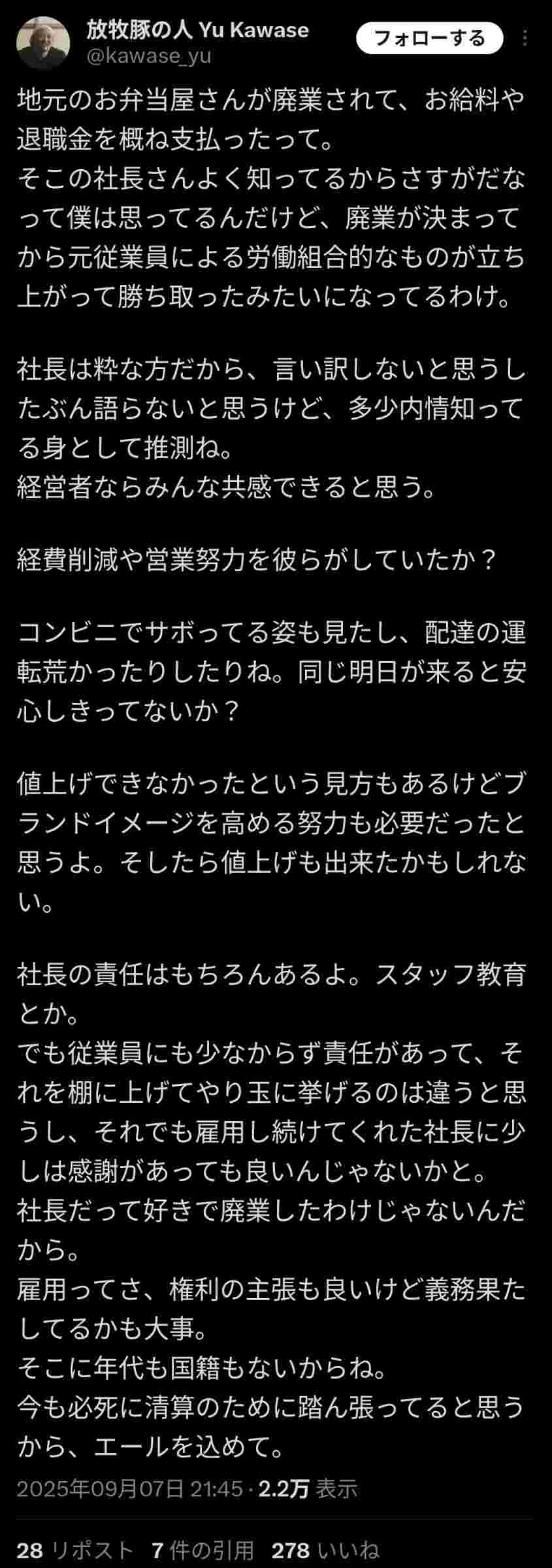 ジジイ「地元の弁当屋が潰れた。従業員は社長を責め退職金を勝ち取ったがそれで良いのか?潰れた原因は従業員にもある」