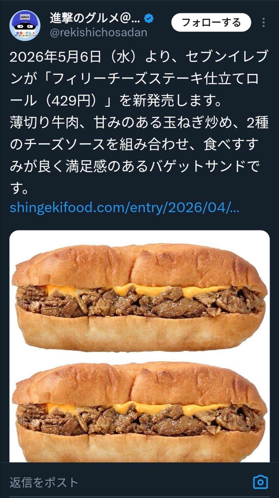 2026年5月6日(水)より、セブンイレブンが「フィリーチーズステーキ仕立てロール(429円)」を新発売します。