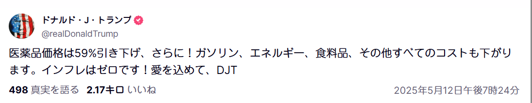 トランプ「薬価が59%引き下げられる! ガソリン、エネルギー、食料品、その他すべてのコストが下がる。 インフレにならない!